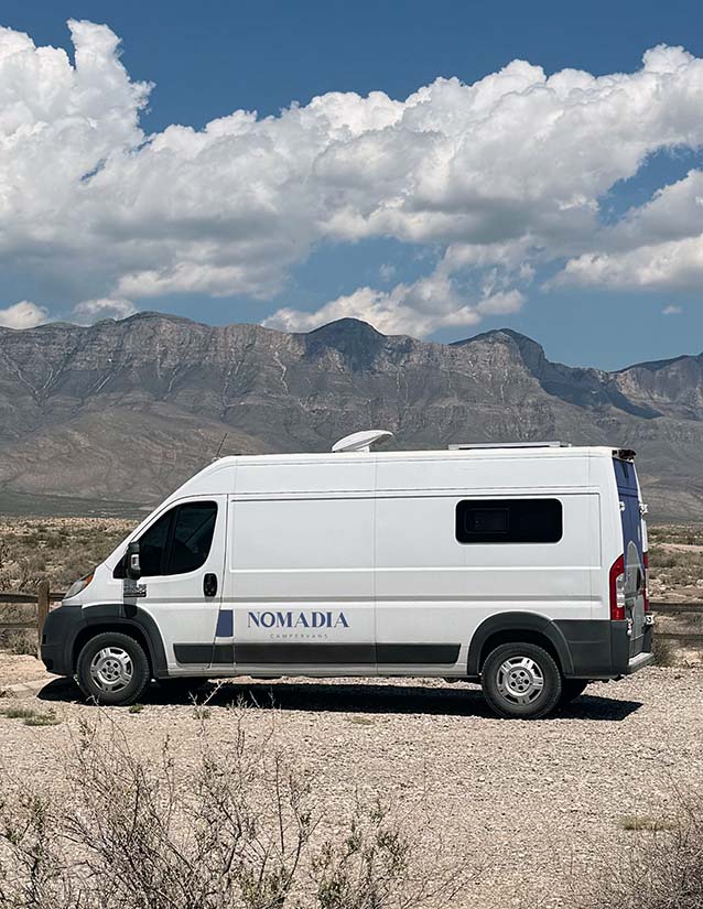 Nomadia is a single camper van currently available for rent in Northeast Philadelphia. The owners plan to expand into a fleet of modern, design-forward camper vans, all bookable through their own app. For the brand’s identity, the goal was a sleek design that reflects both the name and the adventurous spirit of the business. To capture this, I combined the subtle outline of the original camper van with a mountain and sun, creating a landscape that embodies the brand’s sense of adventure.